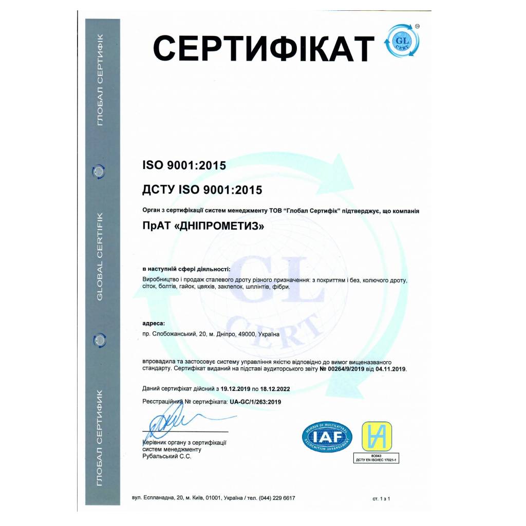 В період з 22.11 по 23.11.2018 р аудиторами органу сертифікації систем менеджменту ТОВ «Глобал Сертиф» проведено роботи з підтвердження відповідності діючої в організації системи управління якістю (СУЯ) міжнародному стандарту ISO 9001: 2015 і національному стандарту ДСТУ ISO 9001 діє до: 2015. Аудиторами підтверджено, що ПрАТ «Дніпрометиз» впровадило і підтримує систему менеджменту згідно з вимогами вищевказаних стандартів.
